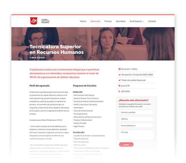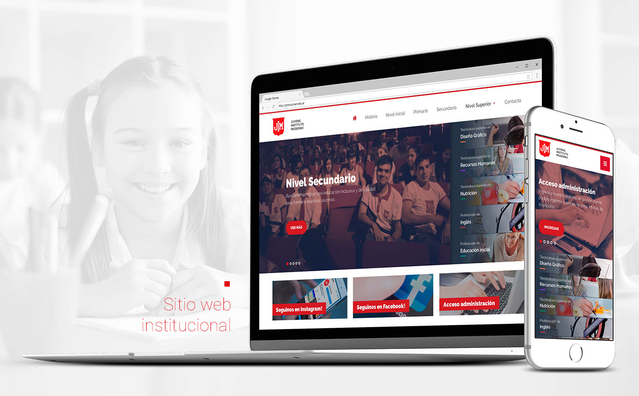 Tuvimos el placer de trabajar en el diseño y desarrollo del sitio web del instituto JIM. Con una destacada trayectoria de mas de 50 años formando niños y jóvenes de la provincia. Resultó ser un importante desafío, para intentar transmitir la calidad del instituto, en su sitio web y convertirlo en su principal canal de comunicación digital. También nos encargamos, desde su lanzamiento, de la gestión integral de la comunicación del instituto en medios digitales, a través de sus redes sociales, con diferentes acciones y campañas de marketing digital.